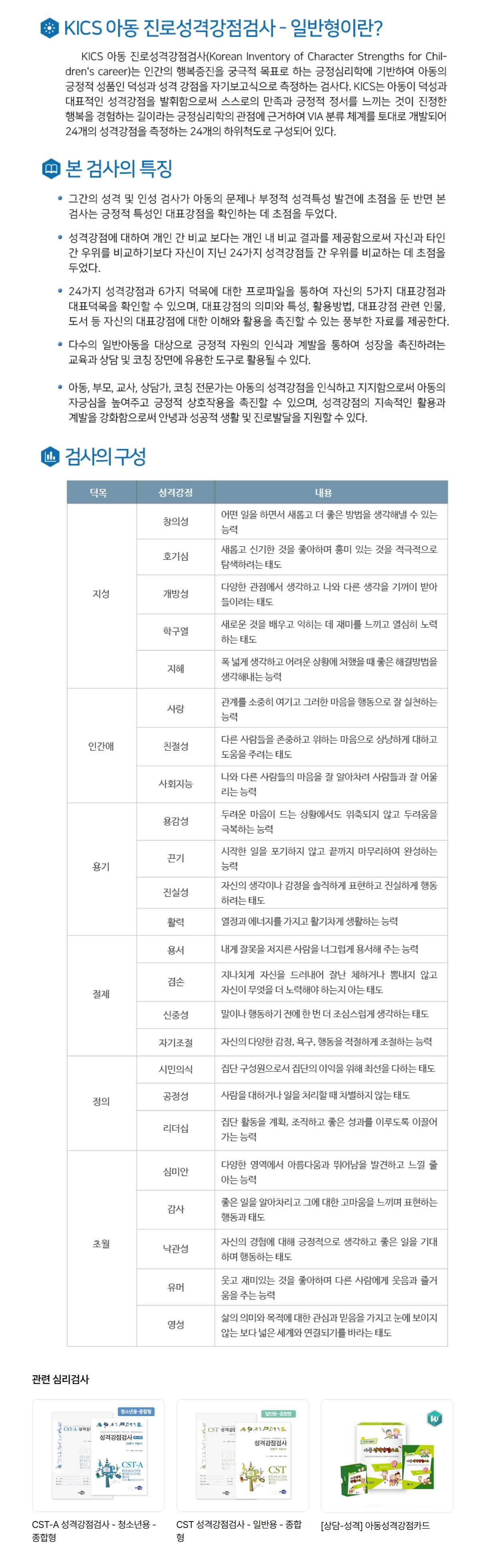 *일반형과 전문가형으로 속성을 선택해 구매해 주시기 바랍니다.아동진로성격강점곰사 일반형과 전문가형은 문항은 동일하나, 검사결과에 차이가 있습니다. 일반형은 검사 결과에 T점수가 없고 원점수 평균만 제시됩니다.※ 온라인 결과 출력에 필요한 채점코드는 인싸이트(www.inpsyt.co.kr) 회원가입 후 아이소리몰로 연락주시면 받으실 수 있습니다.